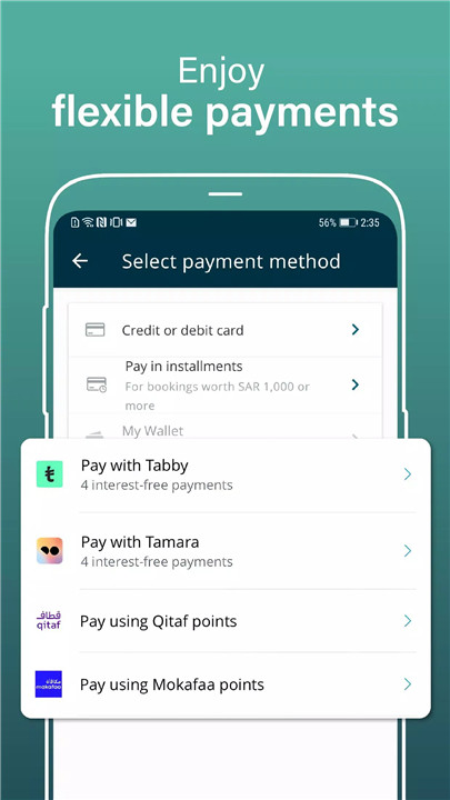 Almosafer supports secure and convenient payment methods, including credit cards, debit cards, mada (KSA), Knet (Kuwait), and installment plans with select banks. Flexible payment choices allow bookings to be paid instantly, later, or directly at the property, depending on availability.