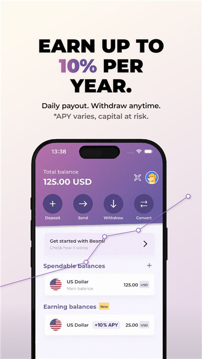 Beans introduces an earning feature that allows users to generate a variable annual percentage yield (APY) on USD and EUR balances. Returns can reach up to 10% per year, calculated daily. Funds remain accessible at all times, with no lock-in periods, ensuring flexibility and control. Returns may vary and are not guaranteed.