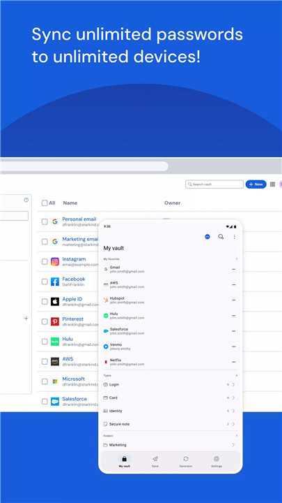 No matter your device or platform, you can securely access your passwords, passkeys, and sensitive data via Bitwarden's mobile app, desktop client, or browser extension. Unlimited syncing means your data is always within reach.