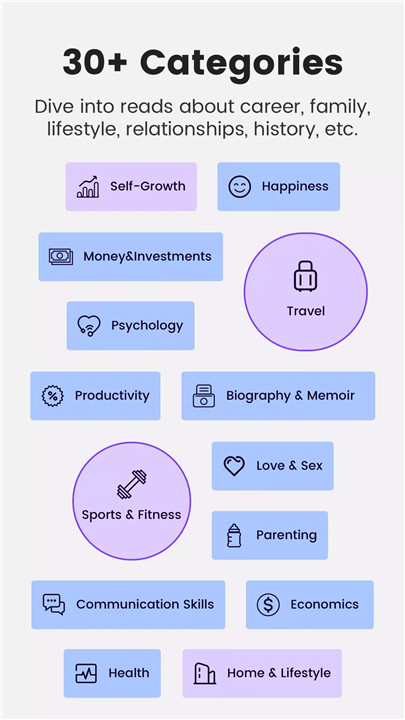 Booksnap provides access to over 30,000 book summaries spanning self-growth, productivity, business, money, happiness, health, family, parenting, communication, investment, leadership, and more. Whether the focus is professional development or personal well-being, relevant knowledge is always within reach.