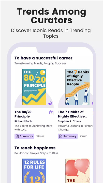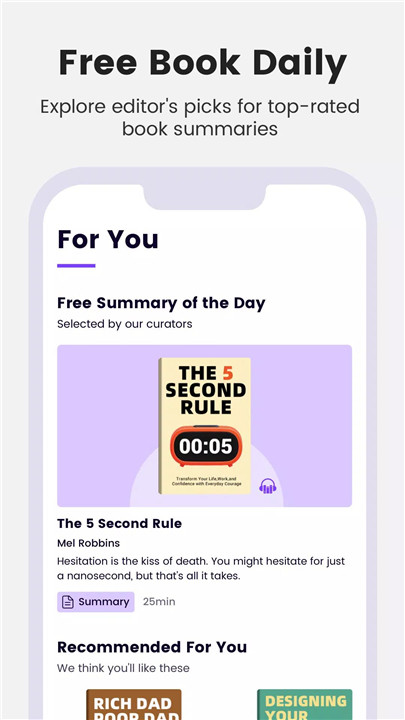 The app delivers tailored recommendations based on interests and goals, removing the guesswork from choosing the next book. Expert-curated collections and themed reading lists focus on trending topics and common challenges, helping users progress faster. Daily book suggestions provide ongoing motivation and discovery.