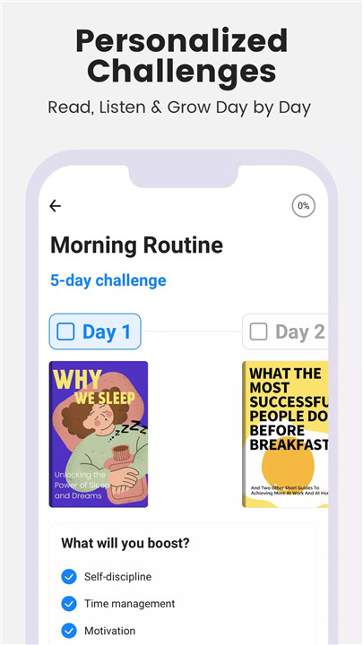 Booksnap offers personalized booklists designed to address specific goals, from improving productivity to strengthening relationships. Reading challenges encourage consistency and make learning more engaging and goal-oriented.