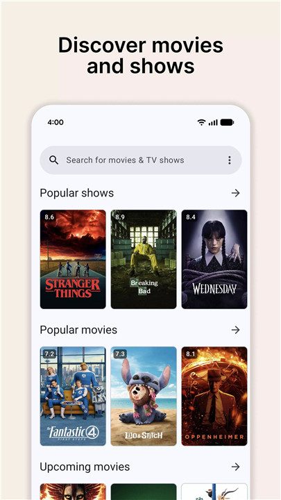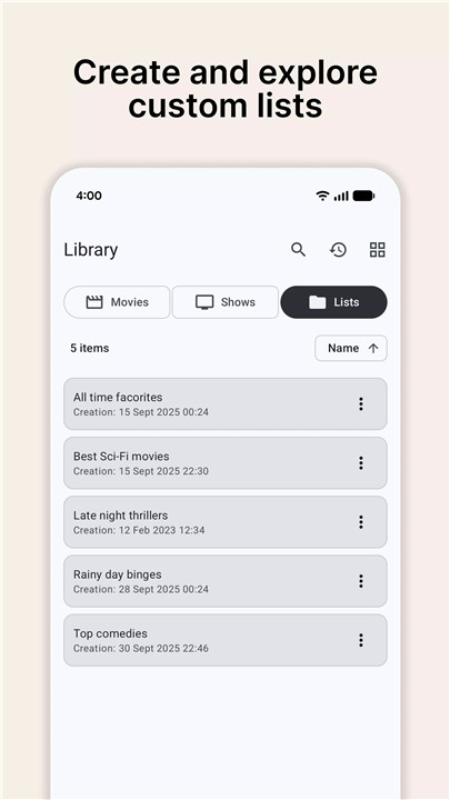 Connect with friends by following their lists and activities. Share movies, shows, or custom lists with a simple tap, making it easy to swap recommendations and enjoy shared entertainment experiences.