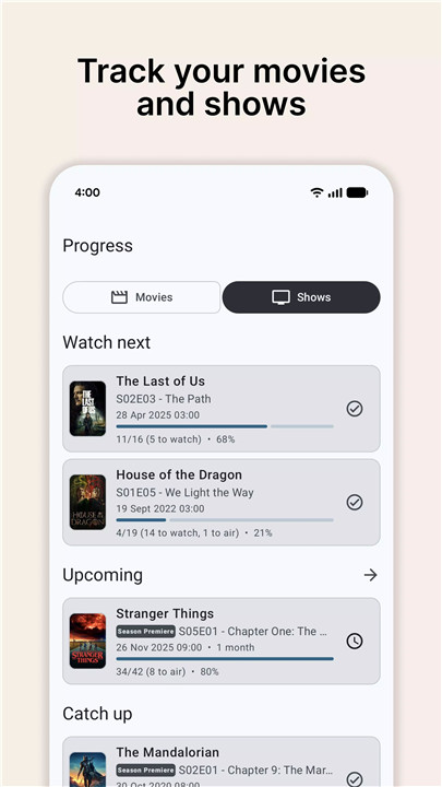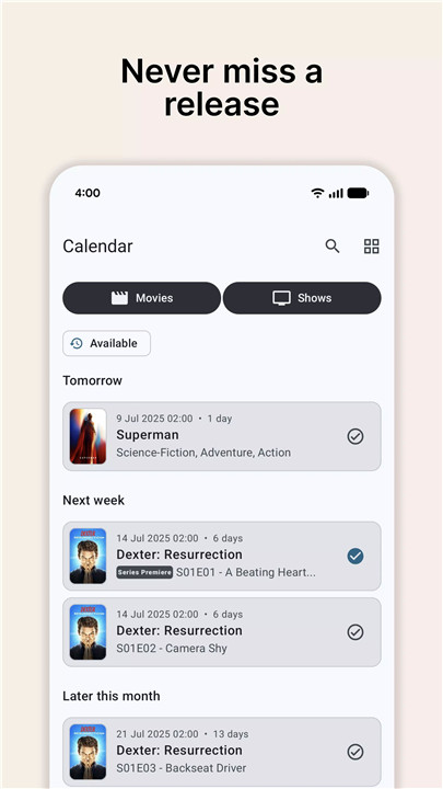 - Watchlist: the bookmark icon now corresponds to the watchlist. Notifications are only scheduled for movies and episodes in the watchlist. Prgoress and calendar are based on watchlisted items.