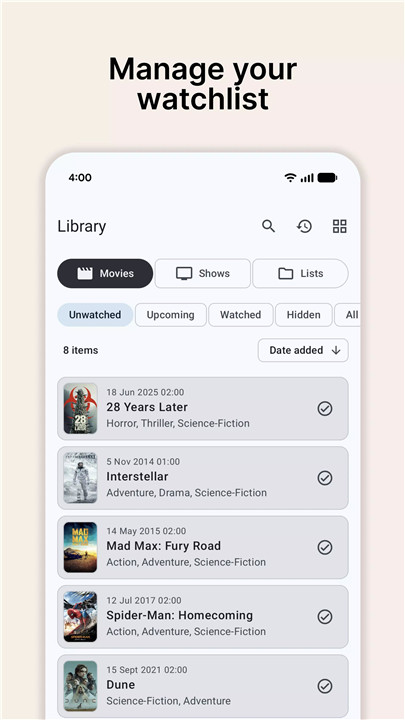 Seamlessly sync your watch history, ratings, and lists with your Trakt account for access across multiple devices and cloud backup. Alternatively, save your data locally with backup and restore options to keep your watchlists and history secure even without Trakt.