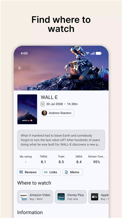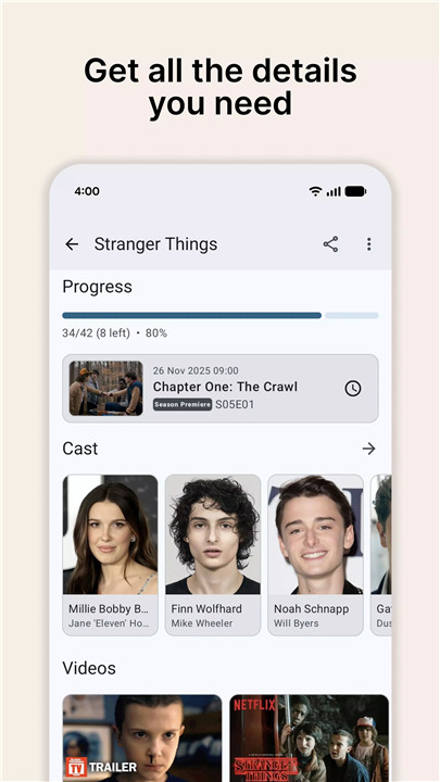 Get full details on every movie, show, season, and episode, including synopses, release dates, runtimes, ratings, and trailers. Enjoy high-quality galleries with posters and backdrops. Read spoiler-free reviews from fellow fans to decide what’s worth watching. Explore cast and crew profiles, filmographies, and follow your favorite actors directly within the app.