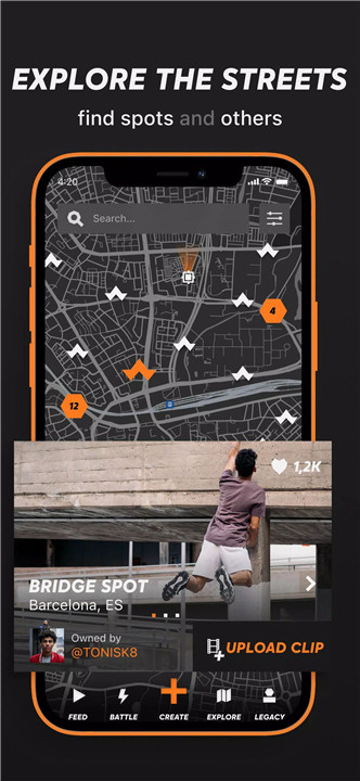 Earn points and achievements by checking in at spots, uploading videos, winning battles, and engaging with other users to increase your rank.