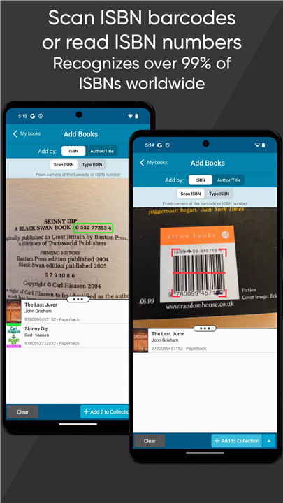 Books can be added by scanning ISBN barcodes, using OCR, connecting a USB scanner, or searching by author and title.