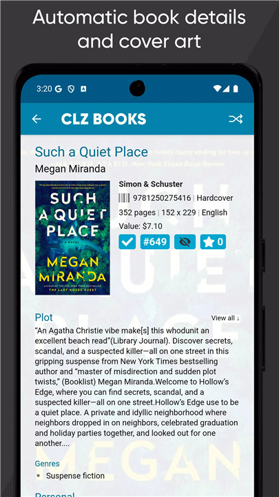CLZ Core automatically provides full book information, including author, title, publisher, publication date, plot description, genres, and subjects. High-quality cover images are added instantly, ensuring a visually complete catalog.