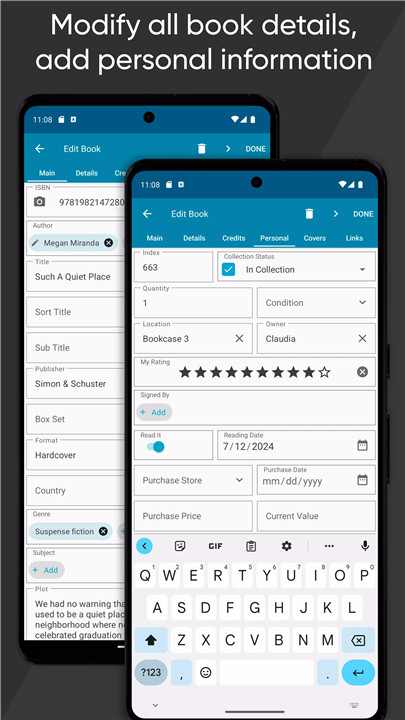 All automatically added fields can be edited as needed. Authors, titles, publication details, and descriptions can be adjusted, and custom cover art can be uploaded for both front and back covers. Personal details such as condition, storage location, purchase date, price, store, and notes can also be added to enhance organization.