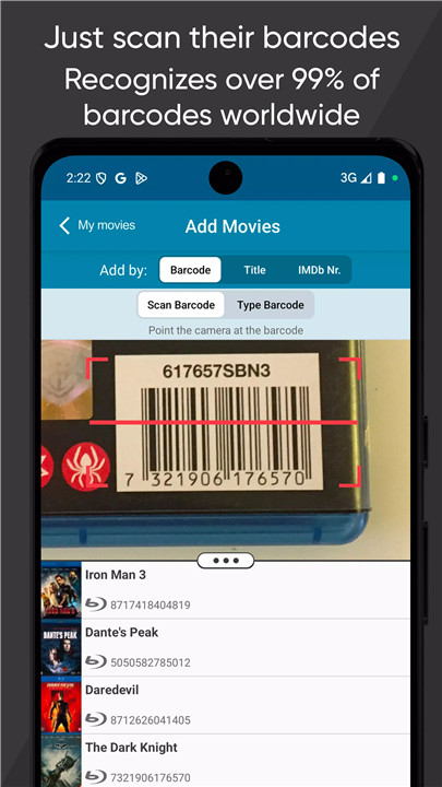Movies can be added quickly by scanning barcodes using the built-in camera scanner, with a guaranteed 98% success rate. Titles can also be added by searching the CLZ Core database by movie name or by using an IMDb number or IMDb URL, making cataloging fast and versatile.