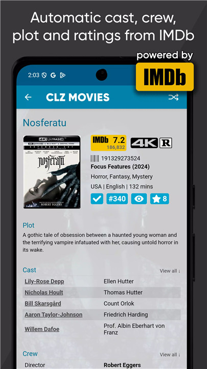 As the only movie collection app with an official IMDb data license, CLZ Movies delivers trusted movie details, ratings, and credits directly within the app. Combined with CLZ Core’s extensive database and flexible customization options, it offers a complete solution for tracking physical and digital movie libraries.