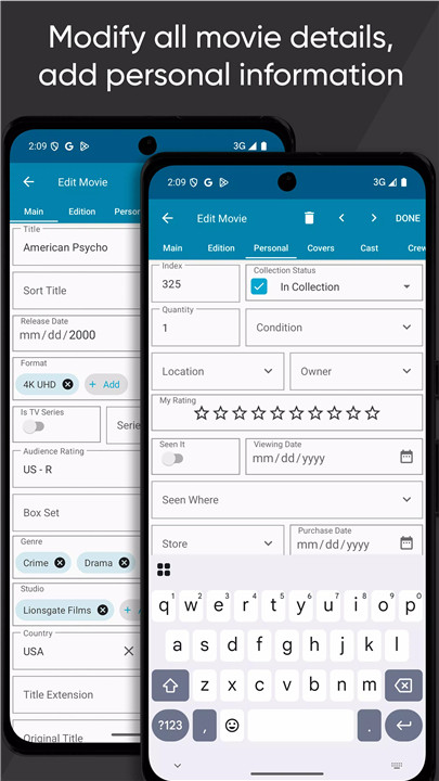 All automatically added data can be edited. Titles, formats, studios, release dates, plot descriptions, and cast or crew listings can be customized. Personal information such as storage location, personal ratings, purchase date, price, store, and notes can also be added. Custom cover art uploads for front and back covers are supported.