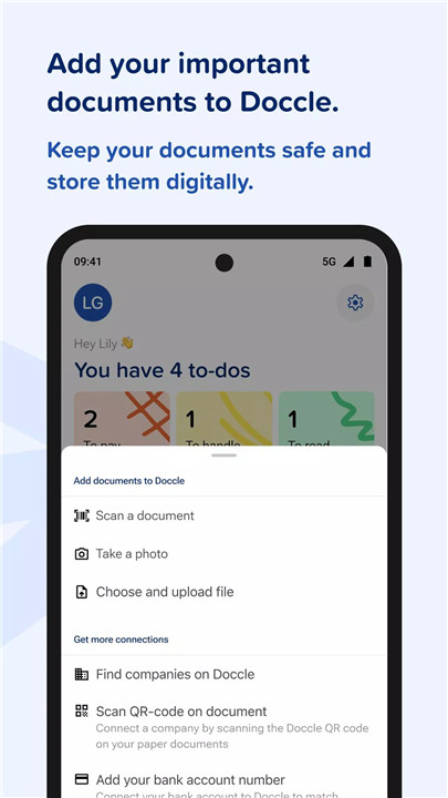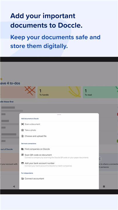 Personal documents can be added directly to the Doccle account by uploading files from email, cloud services, or internal storage. The built-in document scanner uses OCR technology to create aligned, background-free scans that are automatically preserved. This ensures both digital and paper documents are safely stored together.