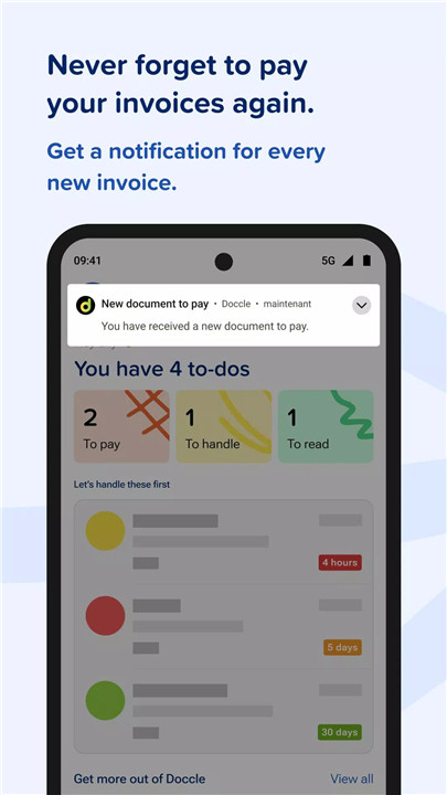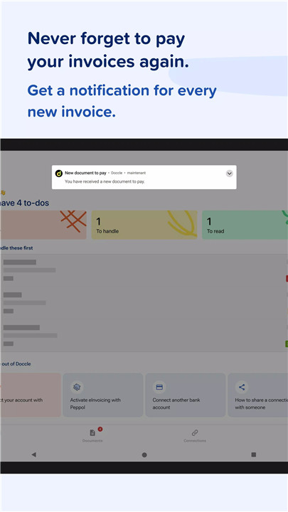 Invoices can be paid easily and securely using trusted banking applications. Doccle also sends payment reminders when due dates approach, helping avoid late fees and reminder costs. Paper invoices can be paid instantly by scanning them with the camera, making the payment process faster and more convenient.