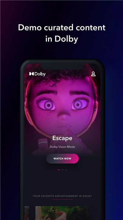 The app features curated content across movies, music, gaming, and other entertainment categories, all enhanced with Dolby Vision and Dolby Atmos.