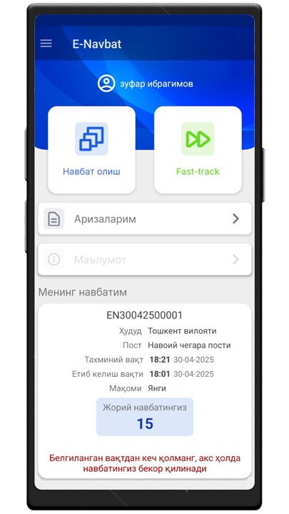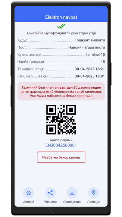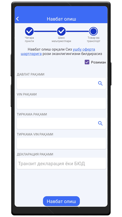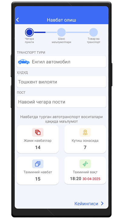 Chegarada transport bilan ўtish uchun navbatni belgilash hizmati Download the latest version of e-Navbat to enjoy new features and updates immediately!