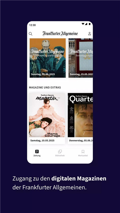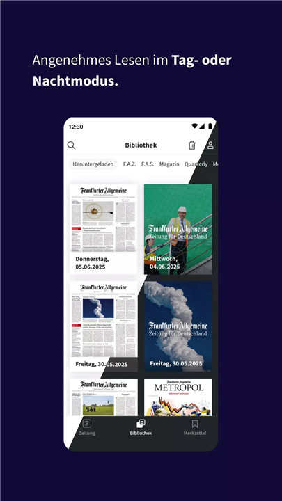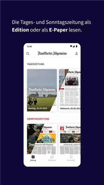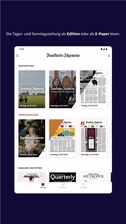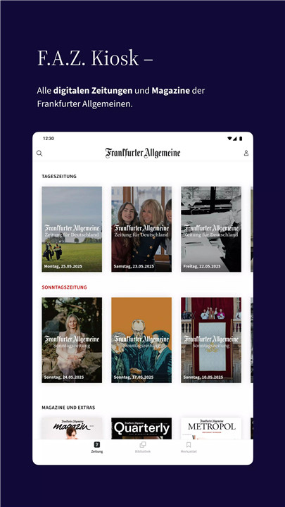 - Im Bereich "Bibliothek": alle angebotenen F.A.Z. Zeitungsausgaben, Magazine und Beilagen.