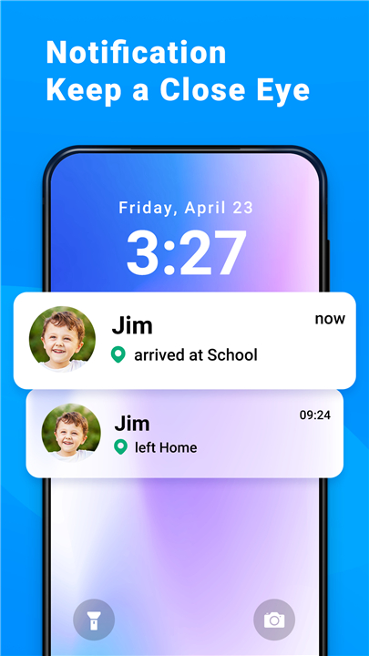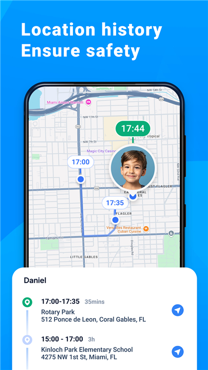 • Receive notifications when your child enters or leaves specific zones such as home, school, or after-school activities.
