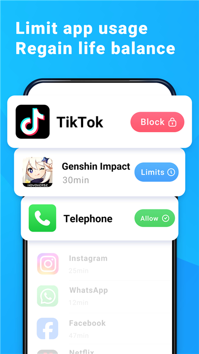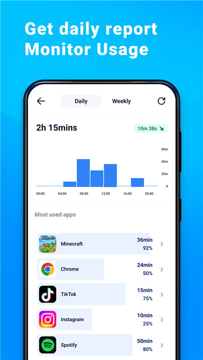 • Get simplified reports of app usage and total screen time.