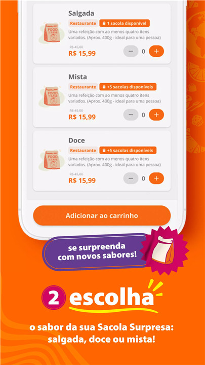 Surprise Bags contain food for immediate consumption that is close to its expiration date or outside standard aesthetic norms, offered at discounts of up to 70%.