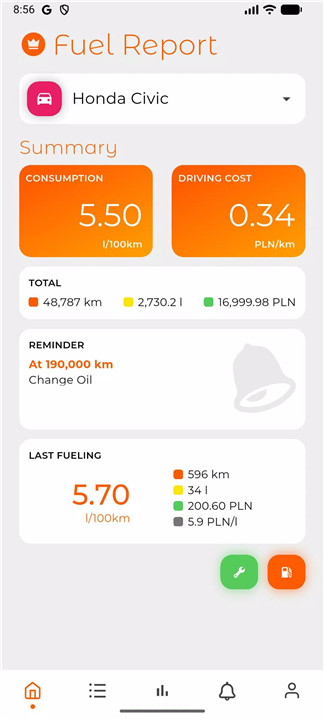 By logging fuel refills and mileage data, the app calculates fuel consumption and displays trends through visual charts.