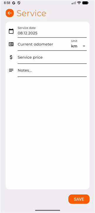 The app allows detailed recording of maintenance services and additional vehicle expenses. Oil changes, tire replacements, repairs, insurance payments, and other costs can all be logged within the app.