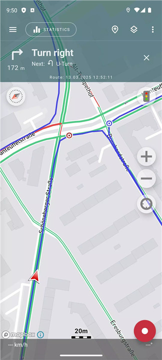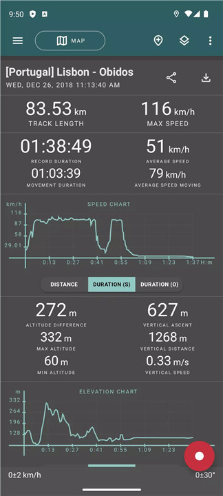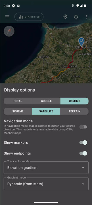 The navigation mode rotates the map in the direction you're heading, simplifying real-time orientation. The app also displays live elevation and speed graphs for better performance analysis.