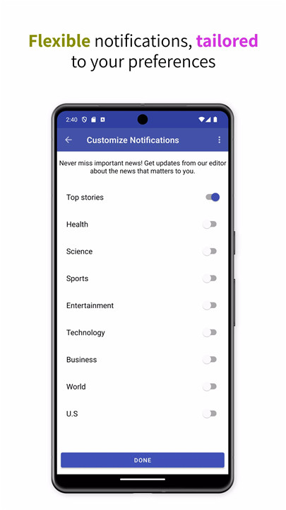 - Customize notifications by topics such as politics, business, sports, technology, or entertainment.