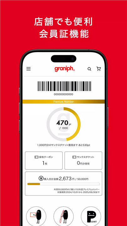 The built-in membership card function allows instant access at Graniph stores. By presenting the app screen at checkout, points can be collected with every purchase. Accumulated points can be exchanged for a Graniph Thanks Ticket, which can be used as a discount. Additional coupons can also be selected and displayed directly from the app, simplifying in-store use.