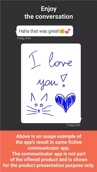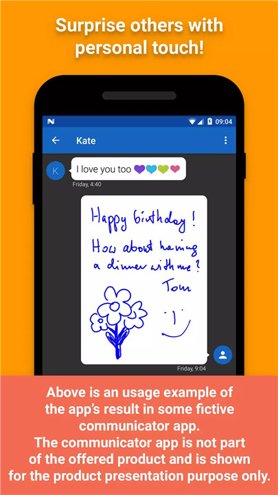 Stand out in a digital world by sending messages that feel personal and authentic. With Handwritten Messages, you can surprise your friends and loved ones with original, handwritten notes that capture the warmth of your own writing. Whether it’s a short message, a doodle, a sketch, or even a piece of art, this app allows you to send it through any SMS, MMS, messenger, social media, or email app of your choice. Make your communication truly unique with the charm of real handwriting.
