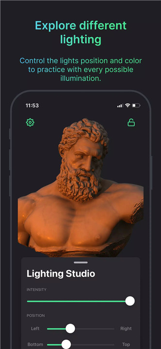 The app provides environmental lighting based on HDR photos and customizable studio lighting with multiple spotlights and colors to study shadows and tones.