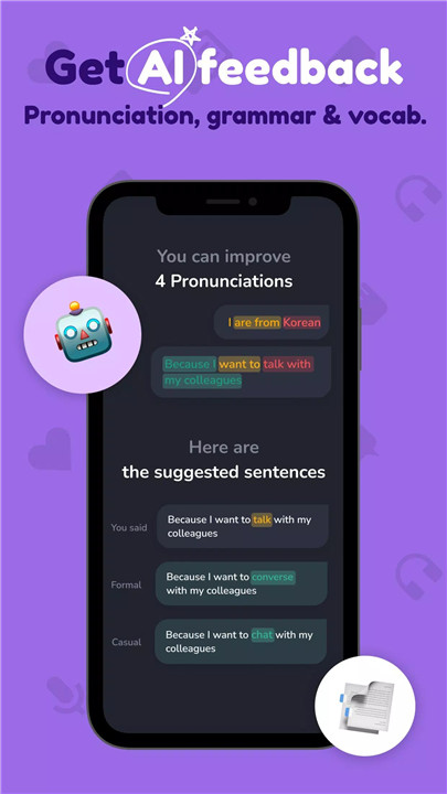 Goguma provides real-time text and audio conversations with instant corrections on grammar, pronunciation, vocabulary, and fluency.