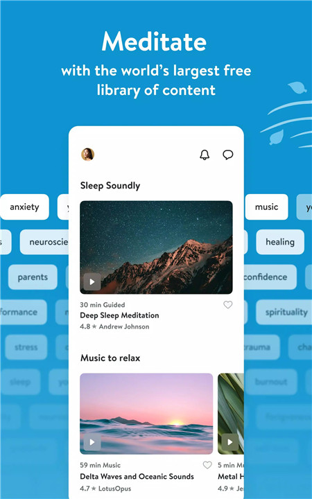 Thousands of music tracks, ambient sounds, and soundscapes support relaxation, focus, and sleep. A fully customizable meditation timer allows sessions to be tailored with interval bells, background sounds, and presets. Progress tracking through stats and milestones helps maintain motivation over time.