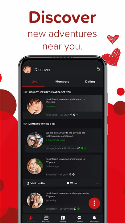 Members can browse local profiles, explore potential dates, and learn about parties or social events in their area. The proximity search feature allows “Live” viewing of nearby members while keeping exact locations hidden, ensuring both excitement and safety.
