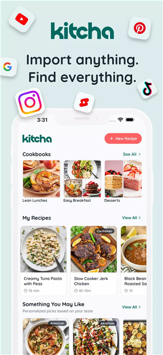 Yes, Kitcha allows saving recipes from Instagram, Facebook, TikTok, YouTube, and Pinterest.