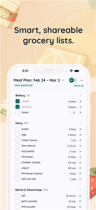 Kitcha generates grocery lists from any recipe or entire meal plans. Items are automatically grouped by aisle for faster shopping, and lists can be shared with friends or family members. Everyone on the list can add, edit, and check off items, creating a collaborative and convenient shopping experience.