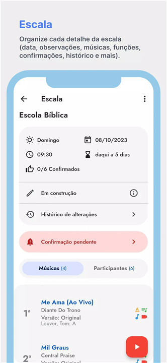 Plan your ministry events with precision. Register event dates, link the music to be performed, and assign members to their roles. LouveApp makes it simple to ensure that every rehearsal and performance runs smoothly. You can even share scale information externally to keep everyone in the loop.