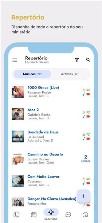Register your ministries, scales, music, and users easily. Assign each participant their specific instrument and role, ensuring that everyone knows exactly where they fit in the team. Keep your repertoire organized so that all songs, chords, lyrics, and videos are accessible at any time.