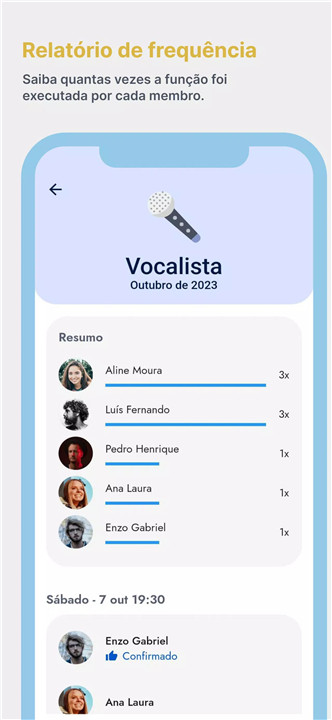 - Agrupamento por função: Visualize os membros escalados organizados por função.