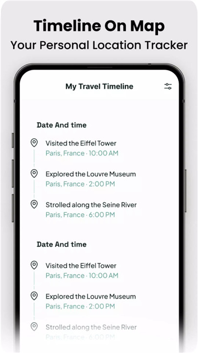 Keep track of every place you’ve been. The location timeline automatically logs visited locations with detailed routes and timestamps. Ideal for remembering road trips, keeping records of travel, or reviewing your daily movements.