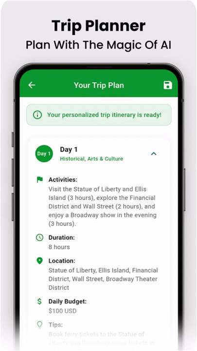 Plan ahead effortlessly with the AI-powered trip planner. Generate custom itineraries, receive tailored recommendations for restaurants, attractions, and hidden spots, and discover personalized travel routes. Great for vacations or weekend getaways!