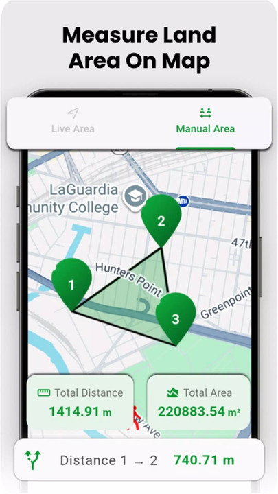 Measure land areas directly on the map by placing markers. Essential for real estate professionals, farmers, or surveyors. Measurements can be saved and easily shared.