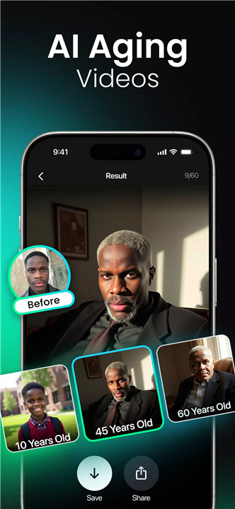 · AI Aging Photo-Videos: See your future self or relive your youth in realistic video clips.