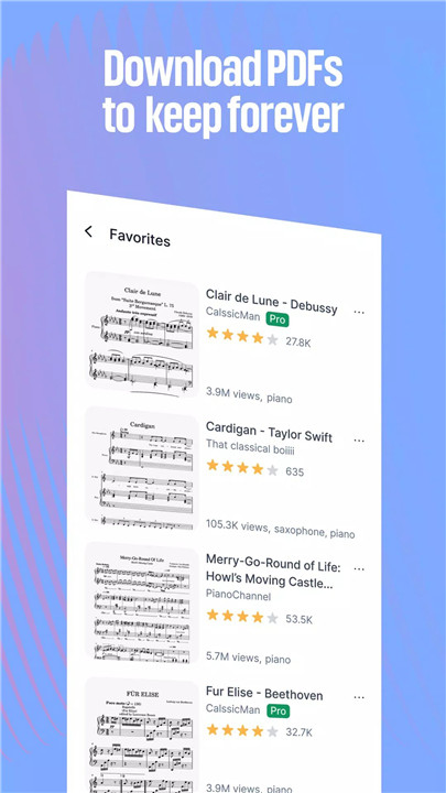 PRO users can transpose music, export files, adjust instrument sounds, download scores offline, and more.