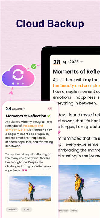 A: No need to panic. If you choose to sync with Google Drive or Dropbox, your entries are safely stored in the cloud. You can recover them on a new device and pick up right where you left off.