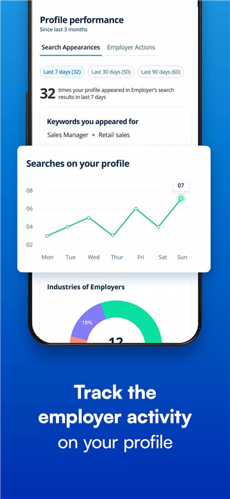 The app provides insights into job application performance. Users can view how well their profiles match specific job requirements, see recruiter interactions, and track the status of submitted applications.