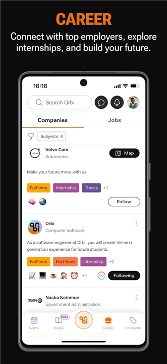 Q: How does Orbi assist me in finding a job or internship for my future career?