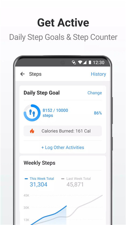 The Trends section displays complete activity history, including daily steps, calorie counts, distance, and weight changes. This data-driven overview makes it easier to understand habits, monitor progress, and stay focused on long-term health goals.