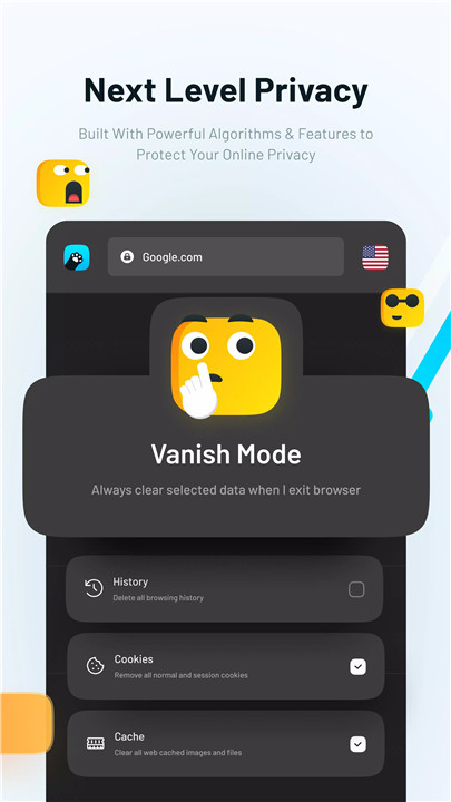Vanish Mode auto-deletes your selected browsing data when you exit the app. Choose what to clear — history, cookies, tabs, cache — and protect your privacy effortlessly.